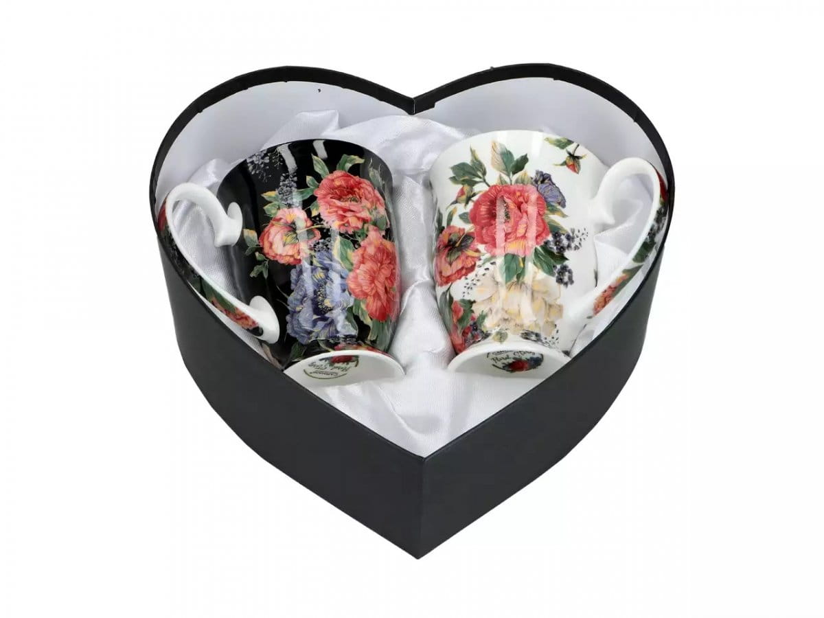 Komplet porcelanowych kubków z motywem kwiatowym zapakowany w eleganckie pudełko w kształcie serca.