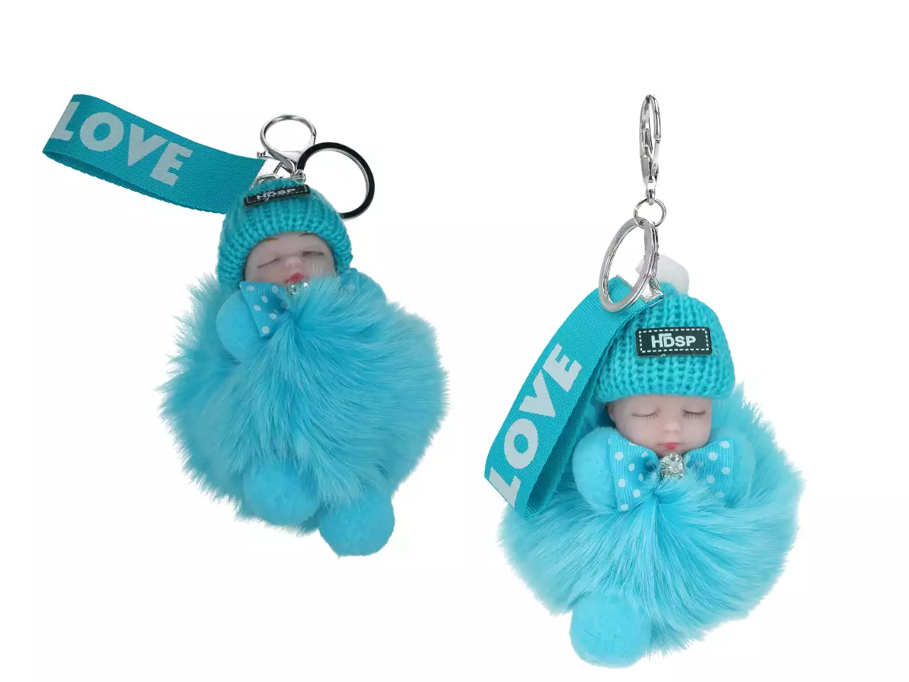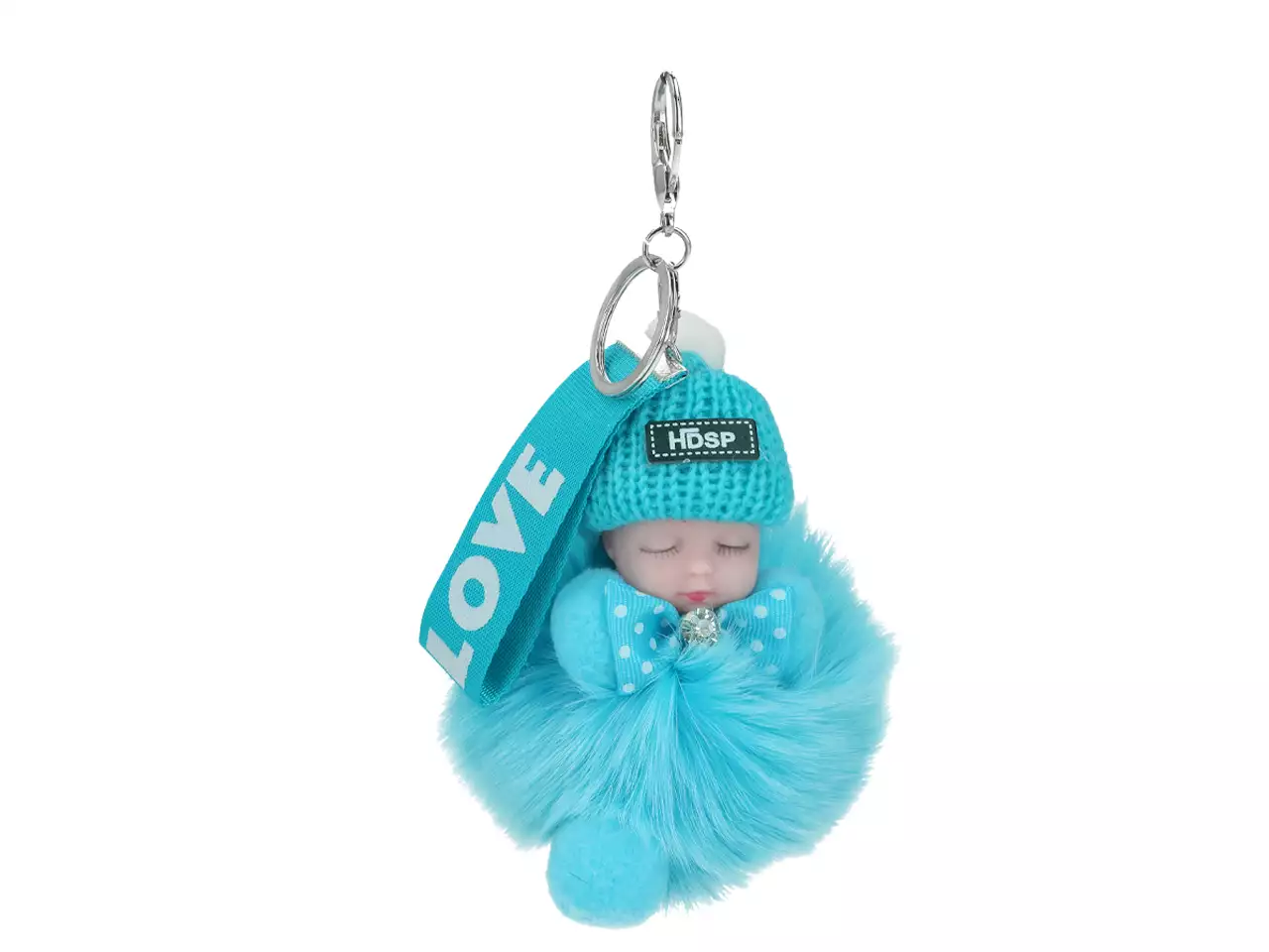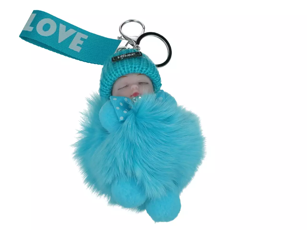 Uroczy niebieski breloczek - pompon - śpiący niemowlak - przywieszka do torebki, brelok do kluczy, słodki upominek.