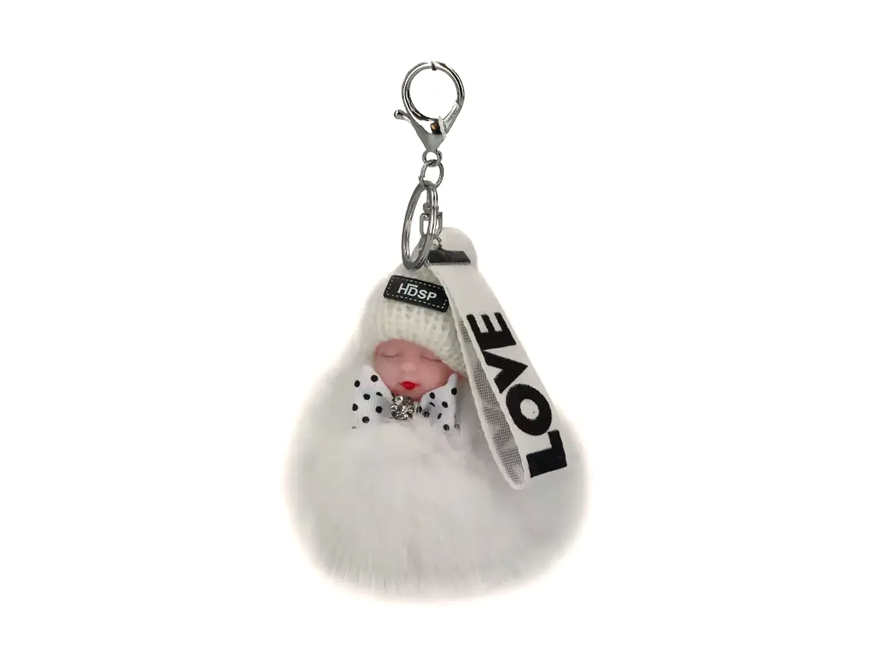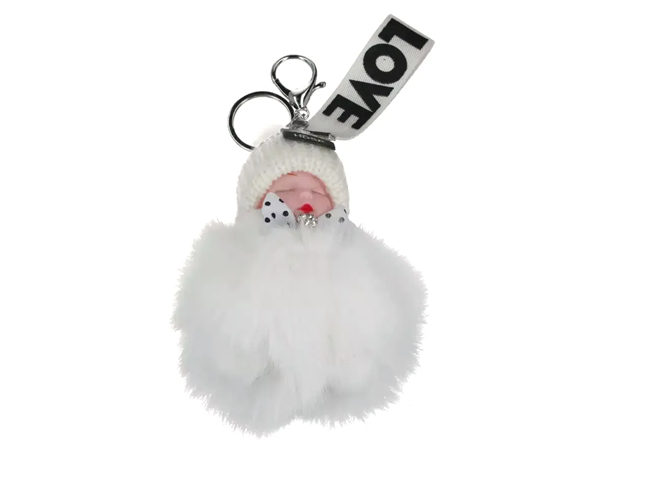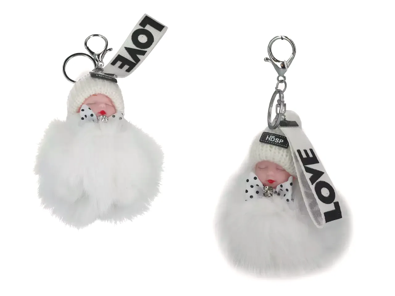 Biały breloczek dzidziuś - śpiący niemowlak w ciepłej czapeczce - urocza przywieszka do kluczy lub do torebki.
