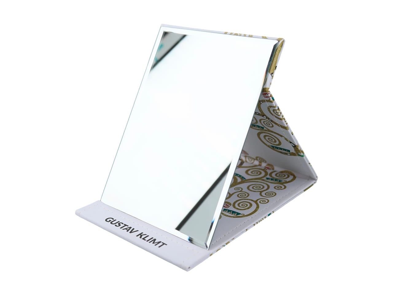 Duże lusterko w składanym etui zdobionym motywem artystycznym. Złożone na płasko przypomina wielkością większy notes.