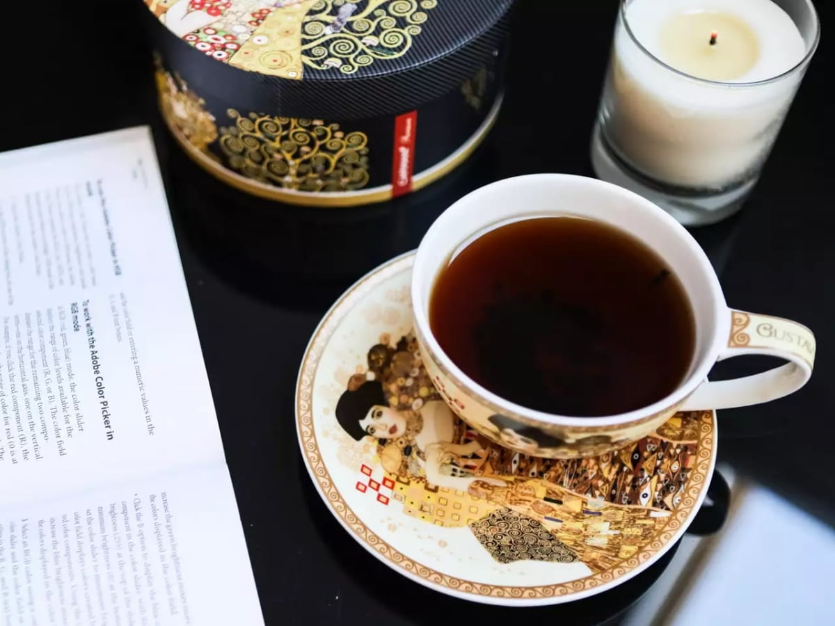 Elegancka porcelanowa filiżanka z motywem z obrazu Gustava Klimta Adele zapakowana w pudełko prezentowe.