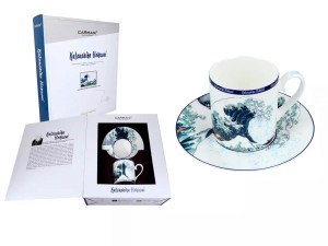Elegancka filiżanka ze spodkiem - komplet wykonany z wysokiej jakości kostnej porcelany zdobiony dziełem Katsushika Hokusai "Wielka fala".