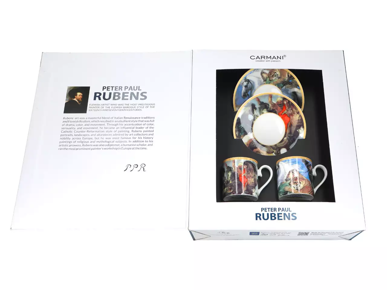 Elegancki podwójny zestaw filiżanek do espresso z motywem artystycznym zaczerpniętym z twórczości Petera Paula Rubensa zapakowany w piękne pudełko prezentowe.