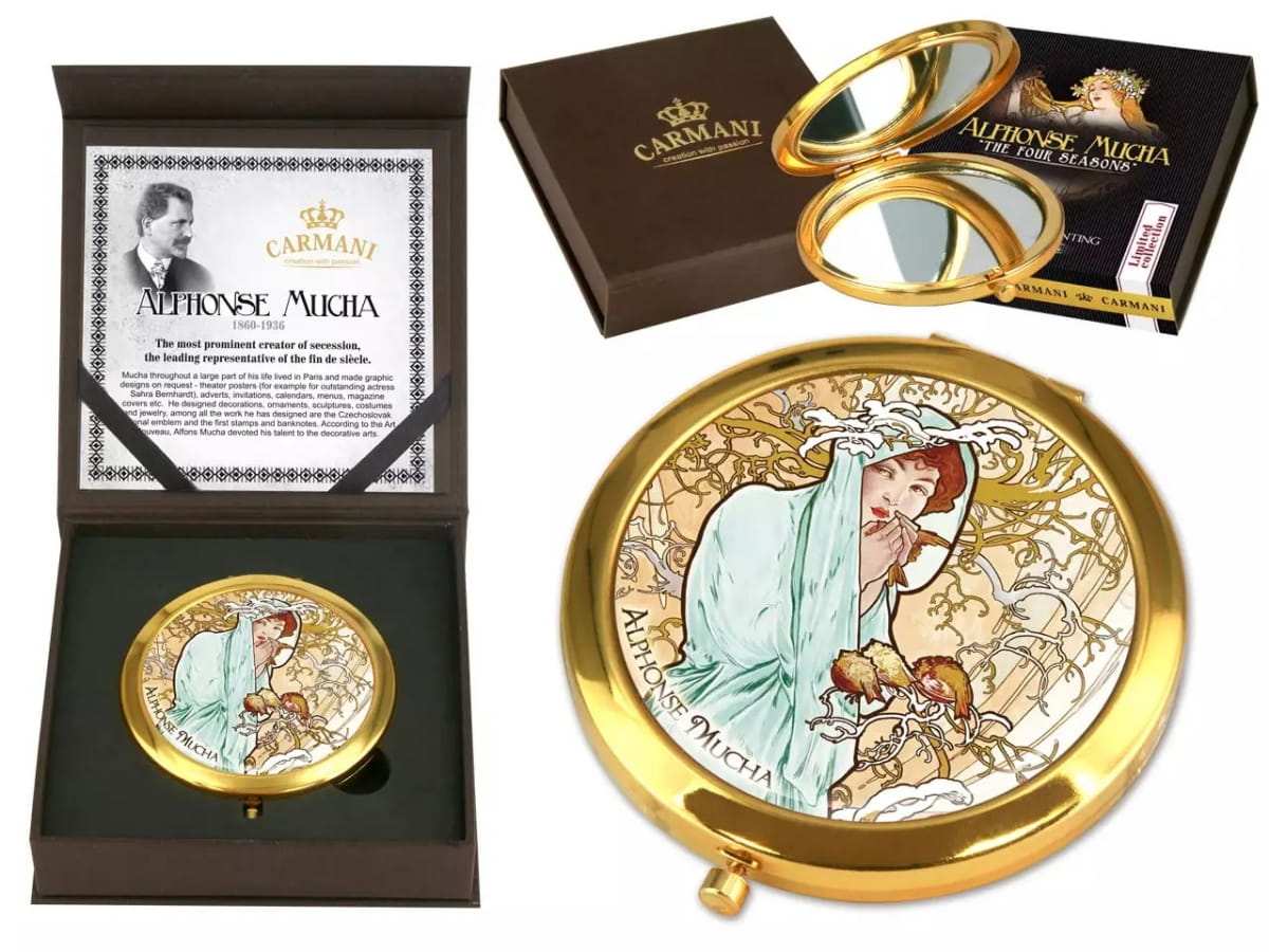 Eleganckie zamykane lusterko do torebki zdobione motywem malarskim zaczerpniętym z twórczości Alphonse Muchy. Piękny prezent dla eleganckiej kobiety.