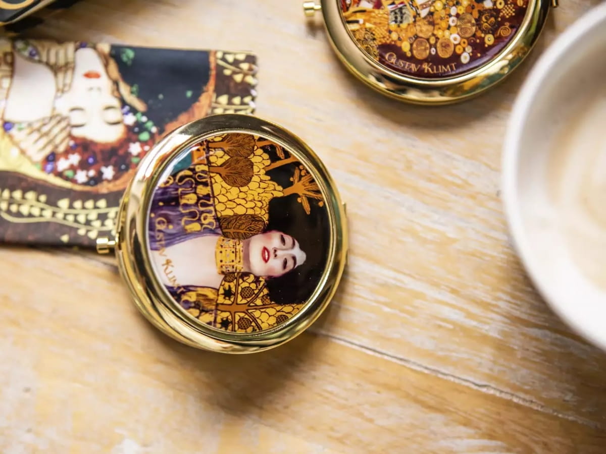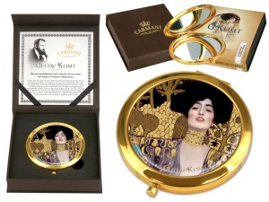 Eleganckie złote lustereczko do torebki zdobione motywem malarskim - obrazem Gustava Klimta "Judyta". Piękny prezent w pudełeczku.