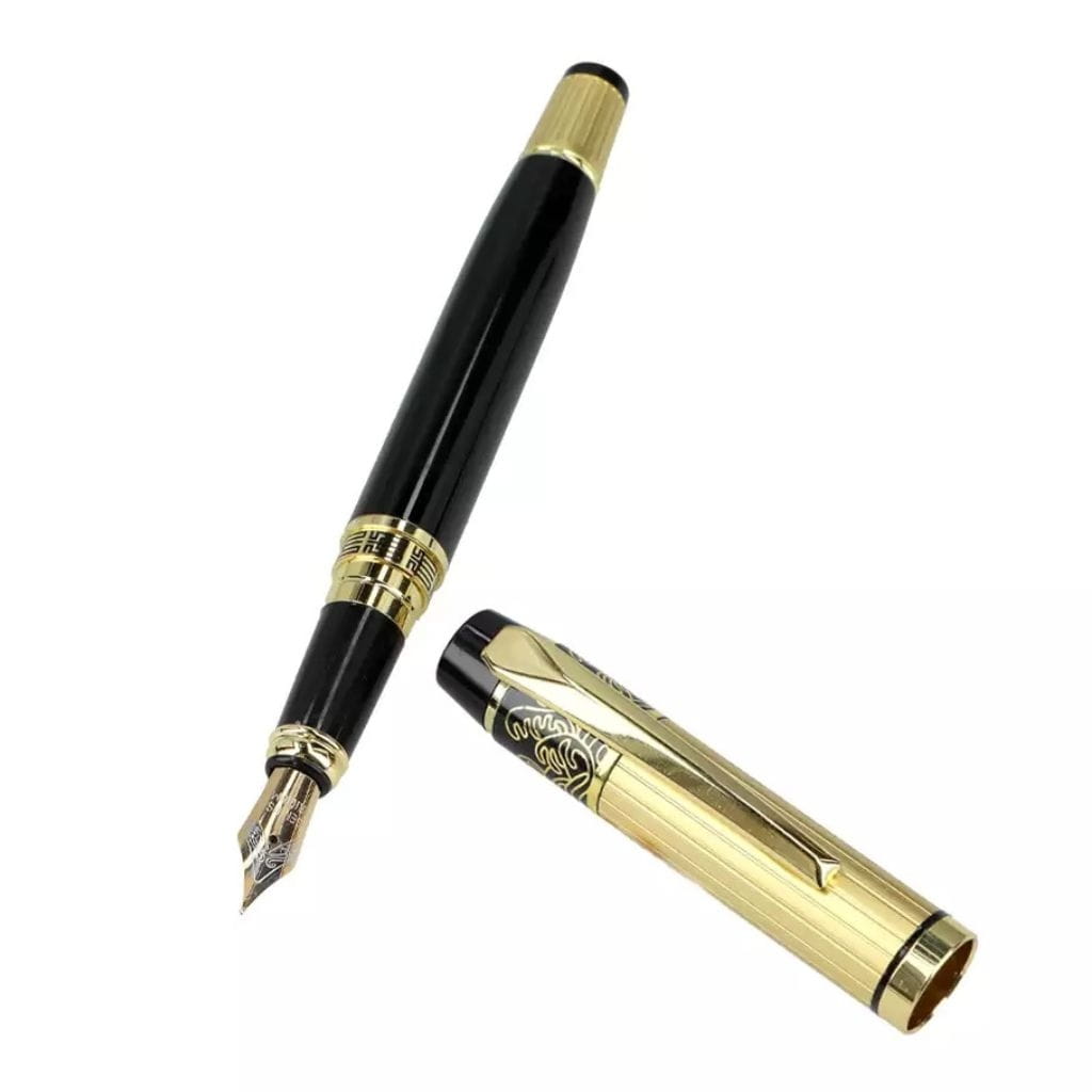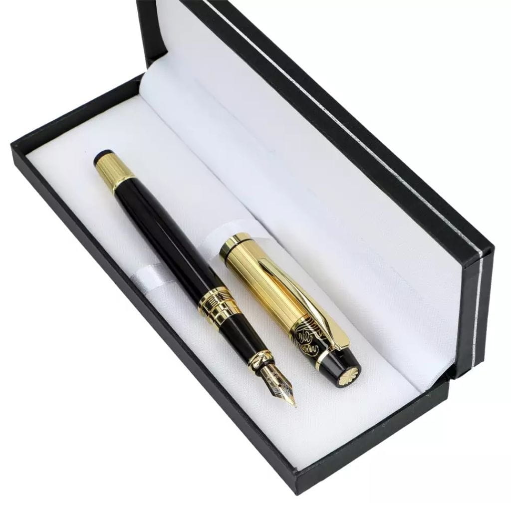 Eleganckie pióro wieczne w etui prezentowym, czarne ze złotymi wykończeniami. Pióro ma pompkę, którą można zamienić na nabój.