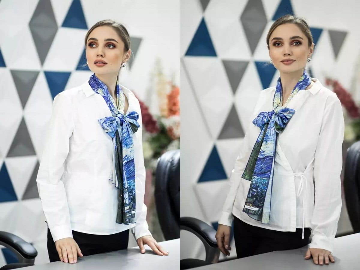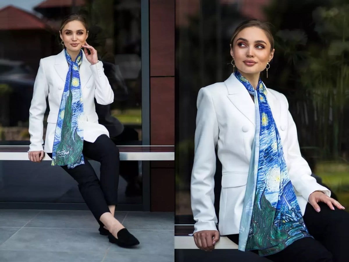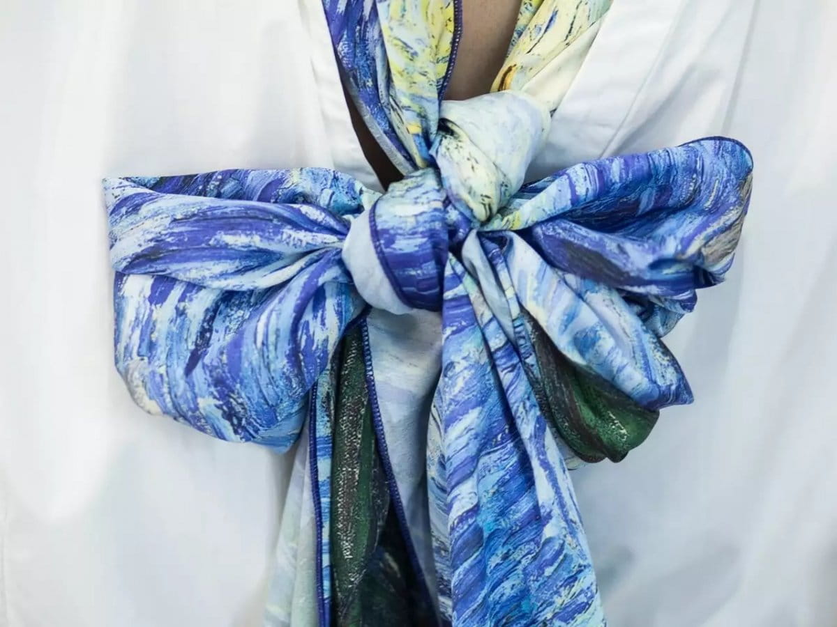 Elegancki zwiewny szal z motywem malarskim - obrazem Vincenta van Gogha Gwiaździsta noc. Wymiary: 45x180 cm. Szal z nadrukiem jednostronnym.