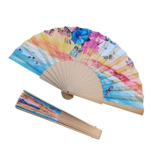 Składany drewniany wachlarz z piękną grafiką na materiale
